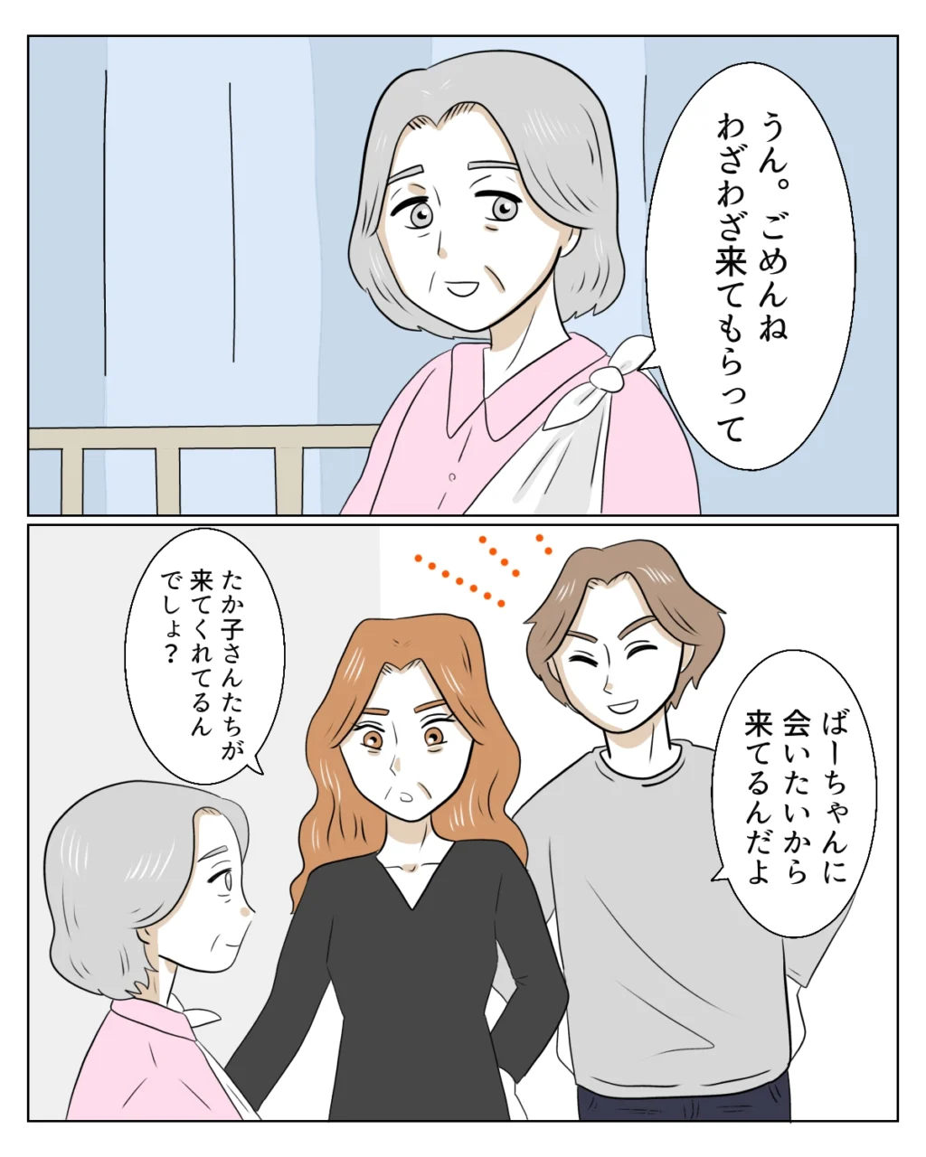 「ごめんね、わざわざ来てもらって」義母は骨折したところが痛むのか、どこか元気のない様子でそう言いました。タクマくんは、「ばーちゃんに会いたいから来てるんだよ」と笑顔で答えます。するとエミさんが、「たか子さんたちが来てくれてるんでしょ?」と義母にたずねました。