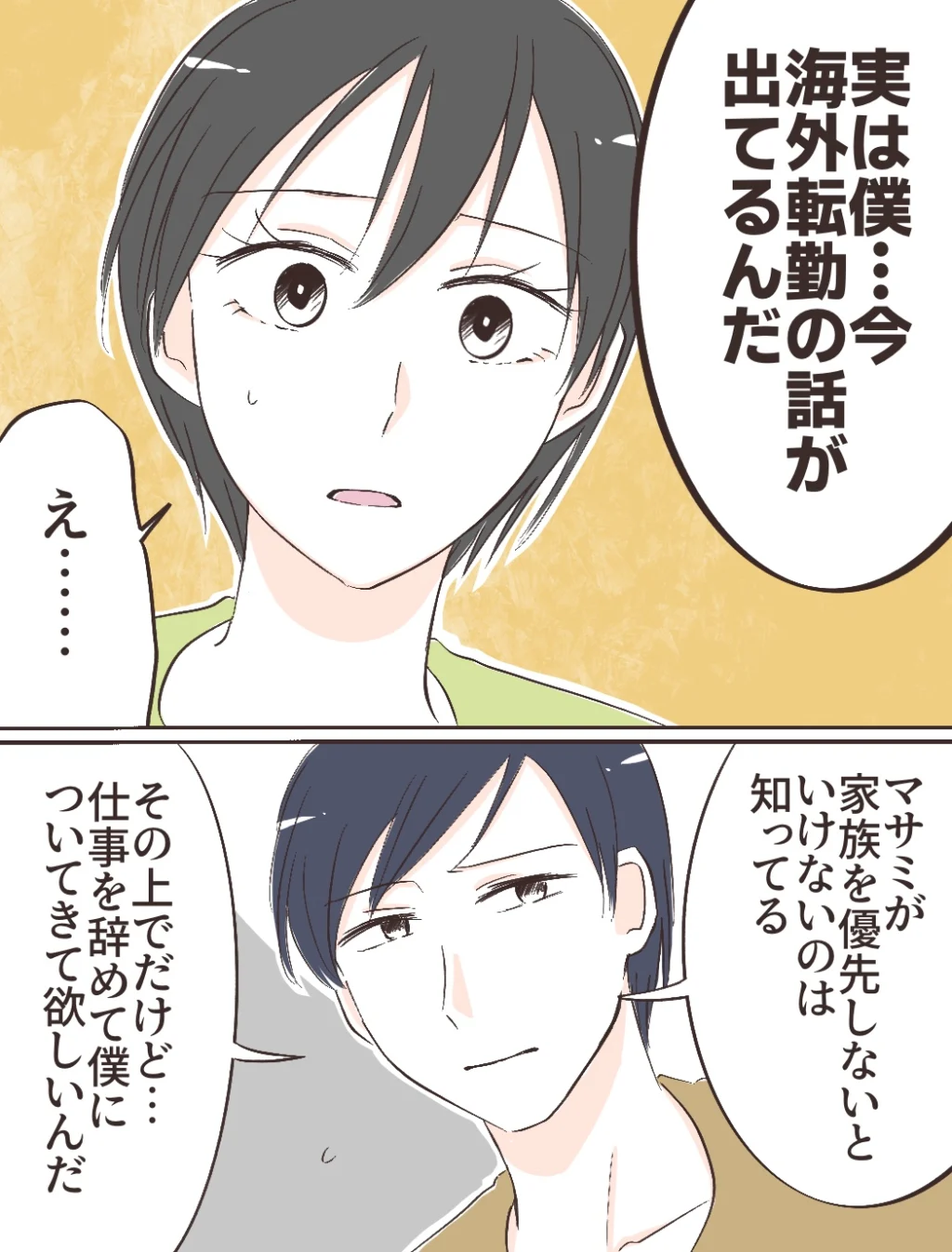 「実は今、海外転勤の話が出てるんだ」ケイスケさんの言葉を聞いて驚いた私は、思わず固まってしまいます。彼は続けて、「マサミが家族を優先しないといけないのは知ってる、その上でだけど、仕事を辞めて僕についてきて欲しいんだ」と言いました。