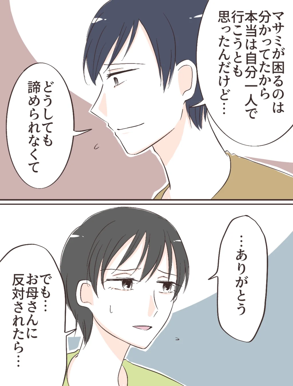 するとケイスケさんは「実家に反対されても良くない!?そろそろ僕たち2人の人生を考えてもいいじゃん」とキッパリ。「出発までにはもう少し時間があるから、考えてみて欲しい」そう言われて、私は複雑な気持ちを抱えながらも「うん」と答えました。