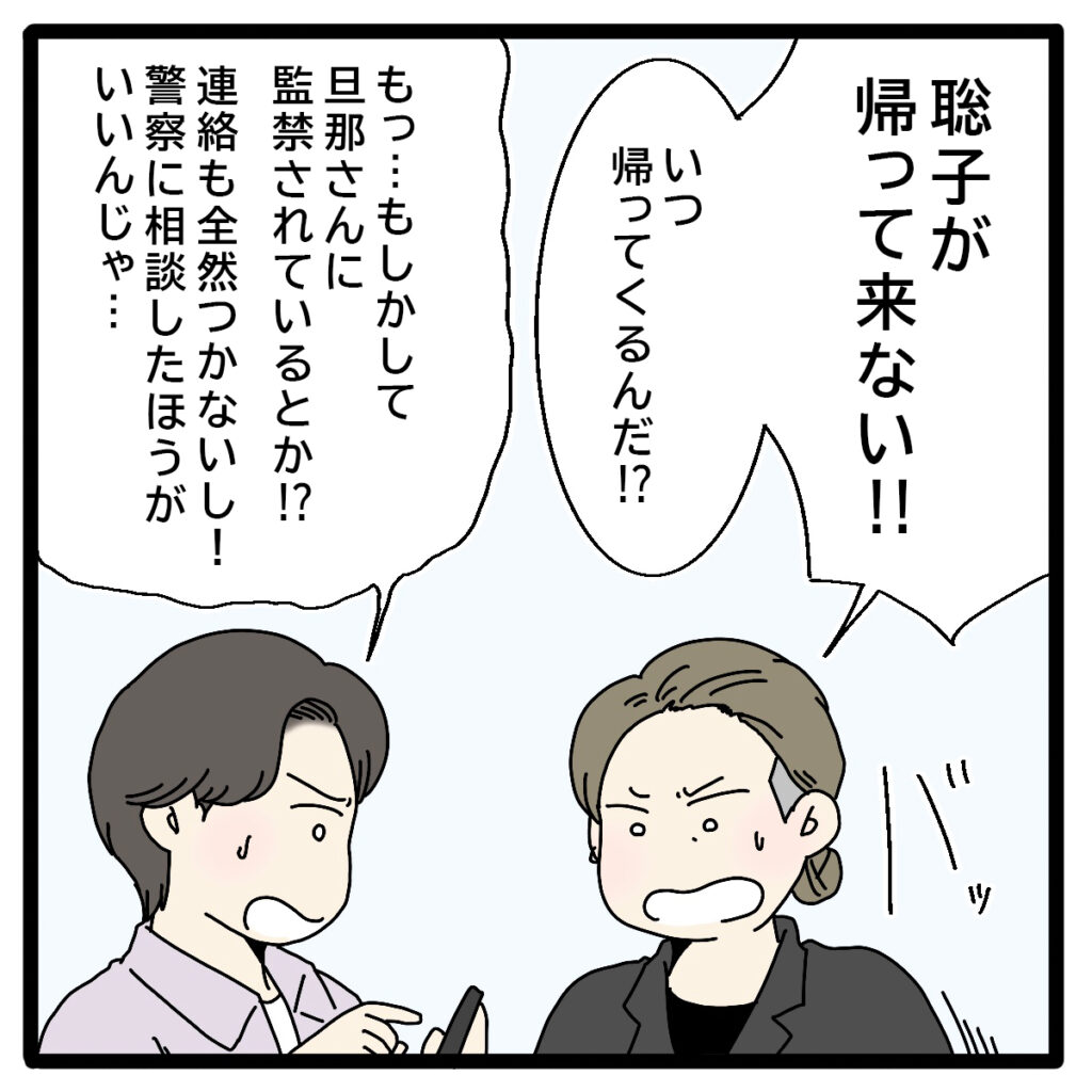 「聡子が帰って来ない!!いつ帰ってくるんだ!?」と総一郎さんが言うと、「もっ・・もしかして、旦那さんに監禁されているとか!?連絡も全然つかないし!警察に相談したほうがいいんじゃ・・」と正志が提案したようで、