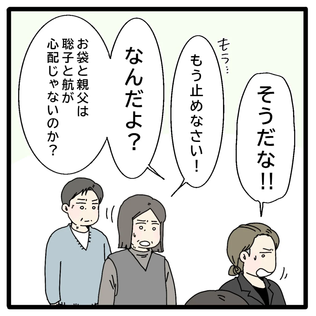 「そうだな!!」正志の提案に賛成した総一郎さんが警察に行こうとすると、「もう・・もう止めなさい!」と総一郎さんのお母さんが止めました。「なんだよ?お袋と親父は聡子と航が心配じゃないのか?」と構わずあたる総一郎さんに、