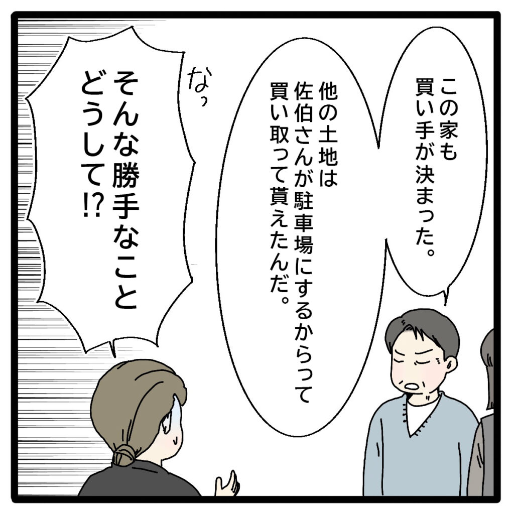 さらに、「この家も買い手が決まった。他の土地は佐伯さんが駐車場にするからって買い取って貰えたんだ」と静かに話すお父さん。両親の言葉を聞いて、「なっ・・そんな勝手なことどうして!?」と総一郎さんが動揺しながら詰め寄ると、
