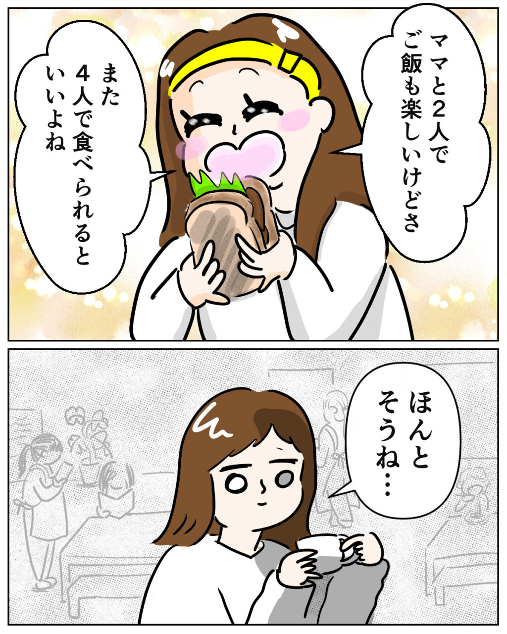 「ママとのごはんも楽しいけど、また4人で食べられるといいよね。」愛花は本当にそう望んでいるのでしょう。私もそれが望みです。でも私の気持ちはどこか暗いままでした。