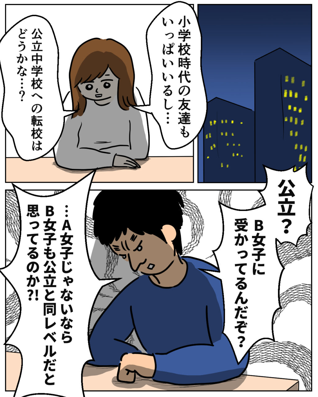 その日の夜、達夫さんが帰って来たタイミングで公立中学校への転校を提案しました。でも、彼から返ってきた言葉は予想外のものでした。「公立?B女子に受かっているんだぞ?・・・A女子じゃないならB女子も公立も同レベルだと思っているのか?」