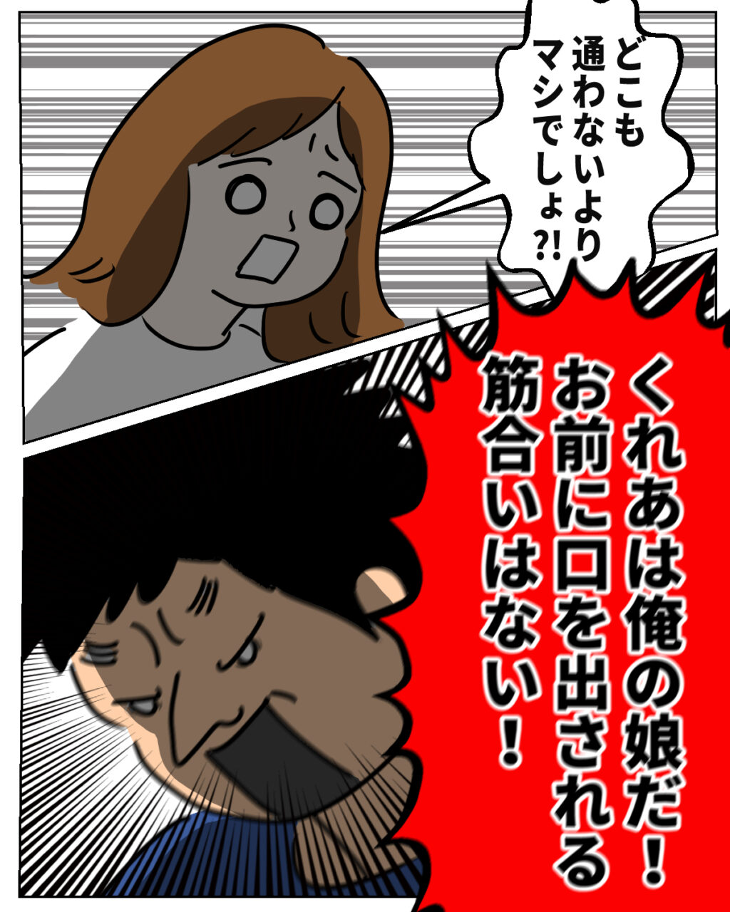 「どこも通わないよりマシでしょ!?」と、私は食い下がります。今の状況よりも良い方法を探したかったから。でも返ってきたのは「くれあは俺の娘だ!お前に口を出される筋合いはない!」というまさかの言葉でした。達夫さんがくれあのことを心配しているのはよくわかっているつもり。でもこんな言い方はあんまりです。