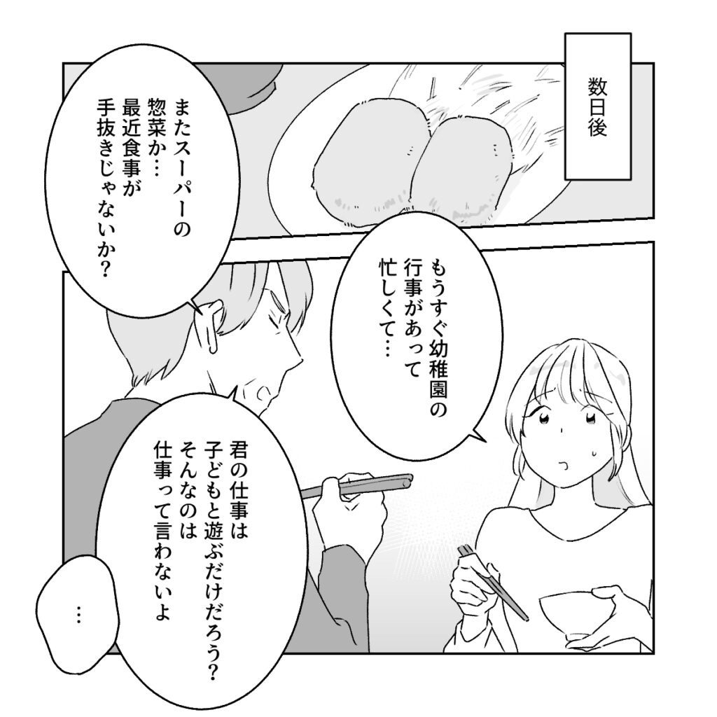 今日は仕事が忙しくて、夕飯をお惣菜に頼ってしまいました。それを見た和男さんは「またスーパーの総菜か?最近食事が手抜きじゃないか?」と話してきます。理由を伝えても「君の仕事は子どもと遊ぶだけだろ?そんなの仕事とは言わない」と私の仕事についても否定してきます。