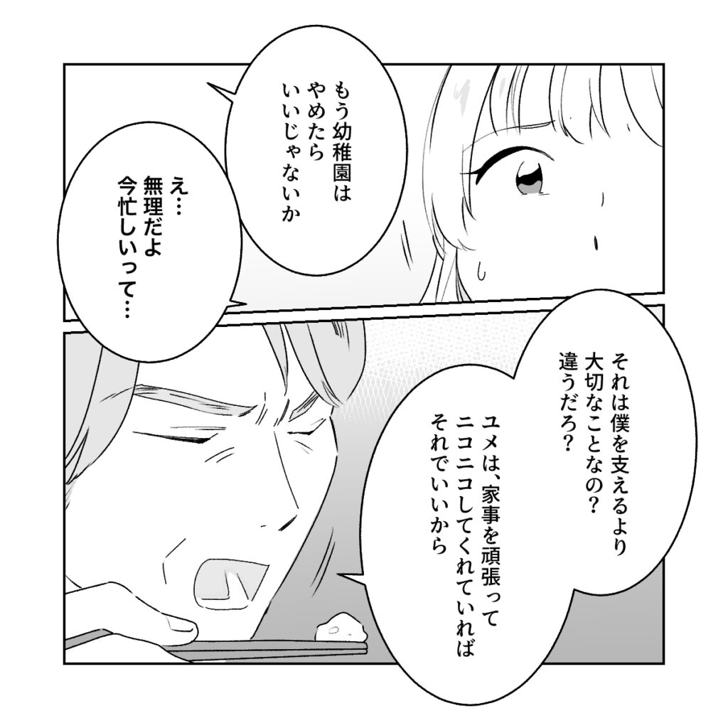 仕事よりも自分を支えることが大切だと主張する和男さん。「もう幼稚園はやめたらいいじゃないか」なんて、仕事はそんな簡単に辞められるものではないのに。今は忙しいから辞めるのは無理だと伝えても、「ユメは家事を頑張ってニコニコしてくれればいいから」と話になりません。