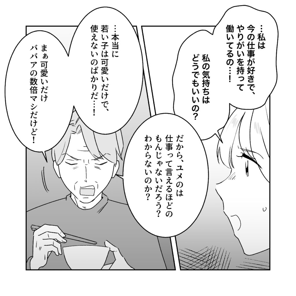 私は、今の仕事が好きでやりがいを持って働いています。それをそんな風に言われるなんて心外でした。しかし、和男さんは「だから、ユメのは仕事って言えるほどのもんじゃないだろう?」と言うばかり。私の気持ちなんて全く考えてくれません。さらには「若い子は可愛いだけで使えないのばかりだ・・・まぁ可愛いだけババアの数倍マシだけど!」とひどい言葉をあびせられました。