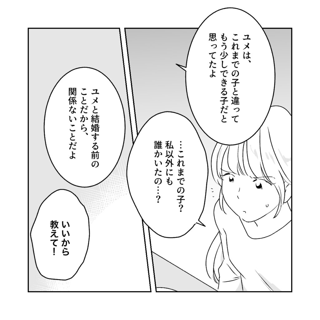 それだけではありません。「ユメは、これまでの子と違ってもう少しできる子だと思ってたよ」と誰かと比べるような発言も飛び出してきました。私以外にも誰かいたのか確認すると、結婚前のことだから関係ないと和男さんは言いました。それでも理由が聞きたくて、私は「いいから教えて!」と伝えました。
