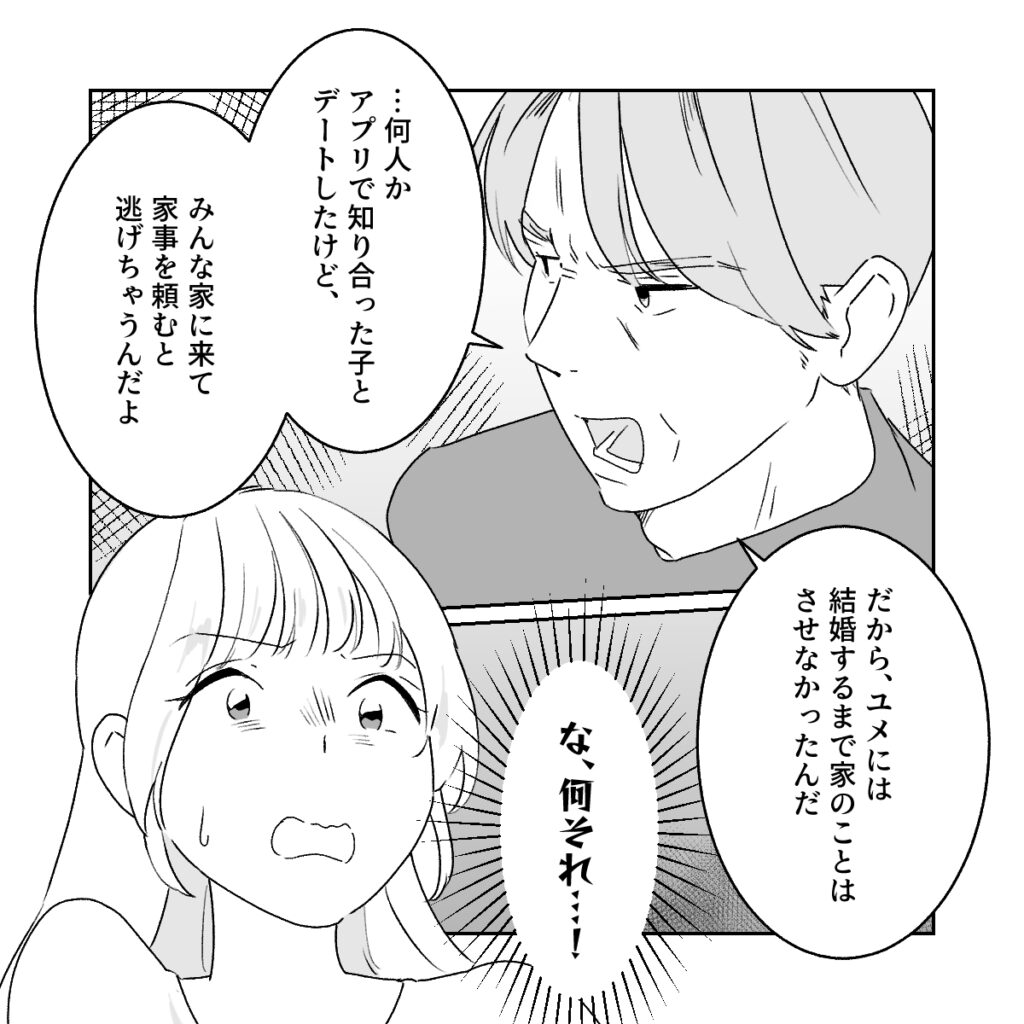 すると和男さんは「何人かアプリで知り合った子とデートしたけど、みんな家に来て家事を頼むと逃げちゃうんだよ」と今までの女性たちが何もできなかったかのように言い出したのです。私に逃げられるのを恐れた和男さんは、結婚するまであえて家のことを何もさせないようにしていたと話しました。