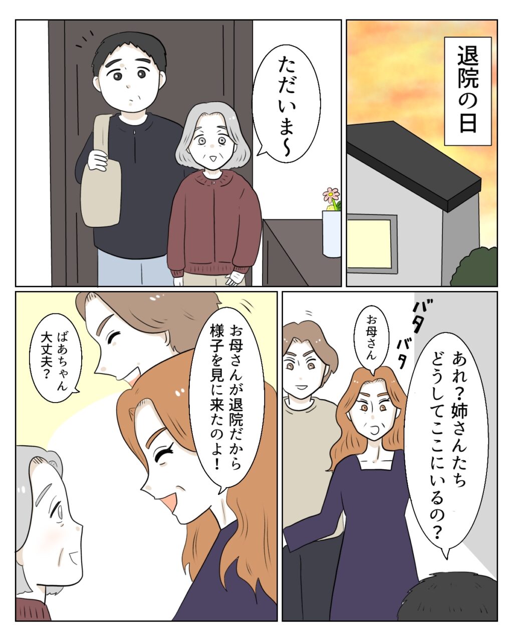 和也さんが義母の退院の手続きに行ってくれている間に、エミさんと甥のタクマくんが家にやってきました。そして義母が家に到着するなり「お母さんが退院だから様子を見に来たのよ!」と笑顔で言うエミさん。タクマくんも「ばあちゃん、大丈夫?」と義母を気遣う言葉をかけます。