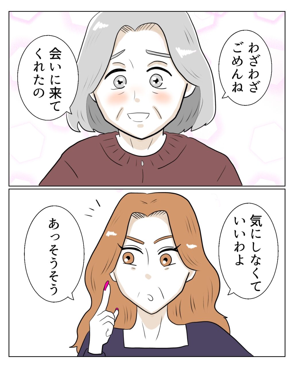2人の言葉に義母は大感激。「わざわざごめんね。会いに来てくれたの?」と、とても嬉しそうにしています。エミさんは「気にしなくていいわよ」と義母に伝えました。そして思い出したかのように・・・