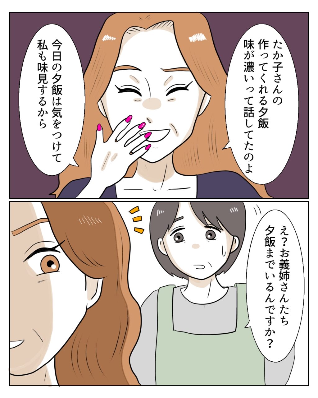 「たか子さんの作ってくれる夕飯、味が濃いって話してたのよ。今日の夕飯は気を付けて、私も味見するから」と言い出します。2人が来ることを知らなかった私は、家族の分しか夕飯の準備をしていません。思わず「お義姉さんたち夕飯までいるんですか?」と聞いてしまいました。