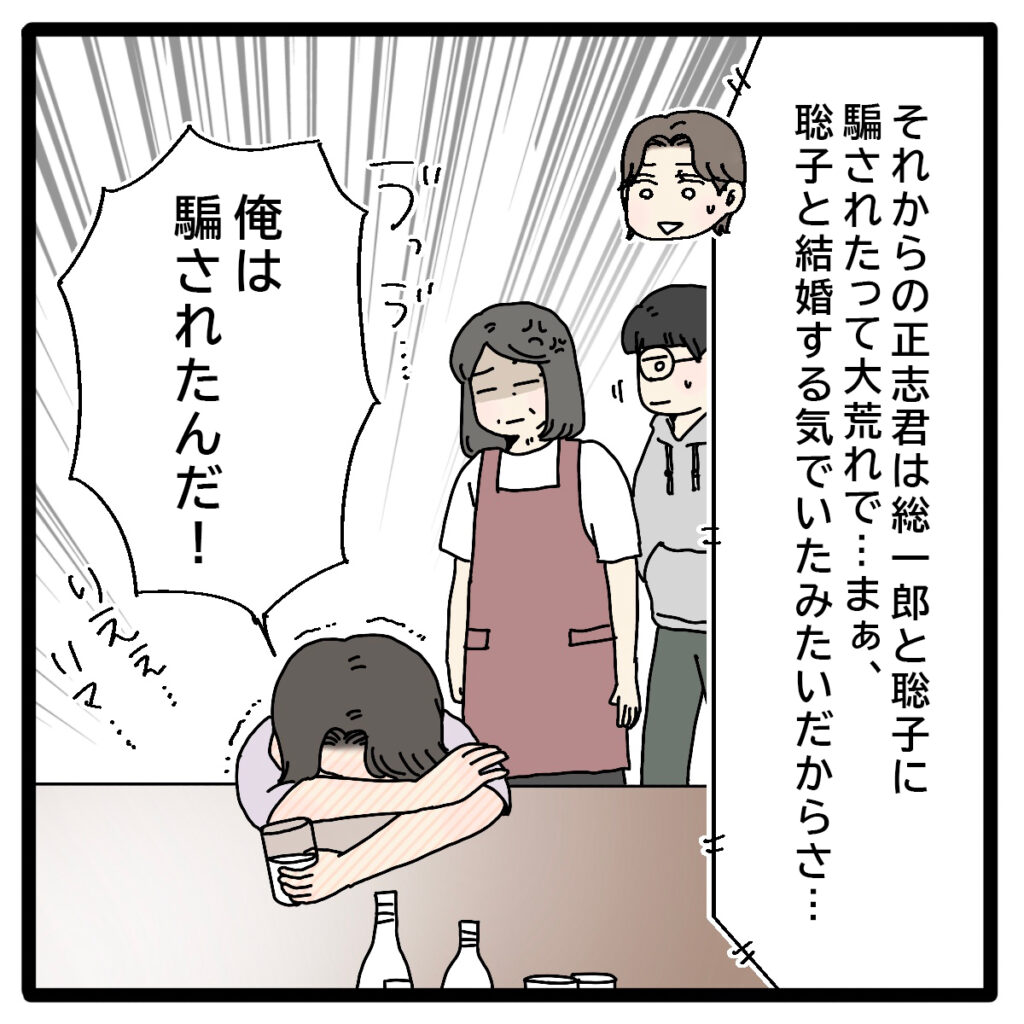 美沙ちゃんの話によると、その後の正志は総一郎さんと聡子さんに騙されたと荒れに荒れていたそうです。聡子さんと再婚するつもりでいたのですから、ショックが大きいのも無理はありません。酒に酔っては「俺は騙されたんだ!」と泣きわめき、周囲からは完全に腫れ物扱い。私からすれば、自業自得と言うほかありませんが・・・。