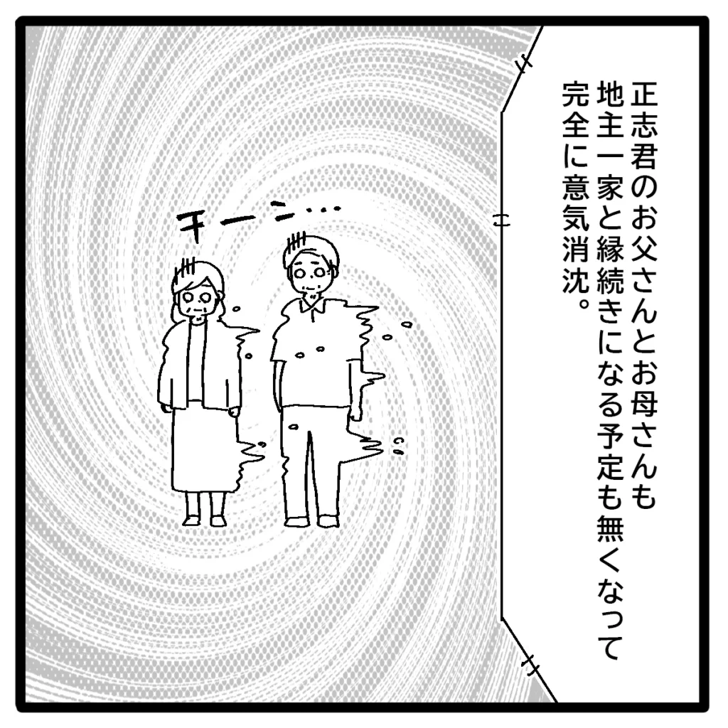 正志のご両親も、地主一家と縁続きになる予定がなくなり完全に意気消沈。これまで家族として過ごしてきた私よりも、地主の妹と結ばれる未来を選んだのですから、正直いい気味だと思ってしまいました。