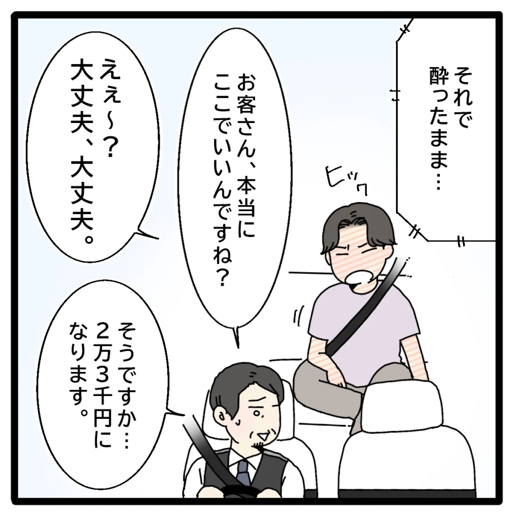 その後、正志は酒に酔ったままタクシーに乗り込み、ある住所まで行くよう運転手さんに頼みました。「お客さん、本当にここでいいんですね?」運転手さんは酒に酔った正志を心配していましたが、正志はそんな彼の言葉を「えぇ~?大丈夫大丈夫」と軽く流します。