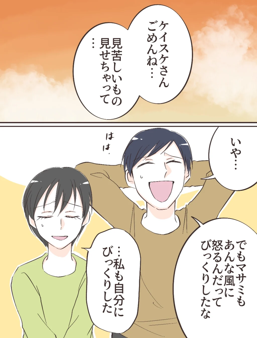 実家を飛び出した後、私はケイスケさんに謝罪しました。ケイスケさんは感情をむき出しにする私に驚いていたものの「でもマサミもあんな風に怒るんだってビックリしたな」と笑い飛ばしてくれました。正直私も、あんな風に自分が反論できるなんて思いしませんでした。