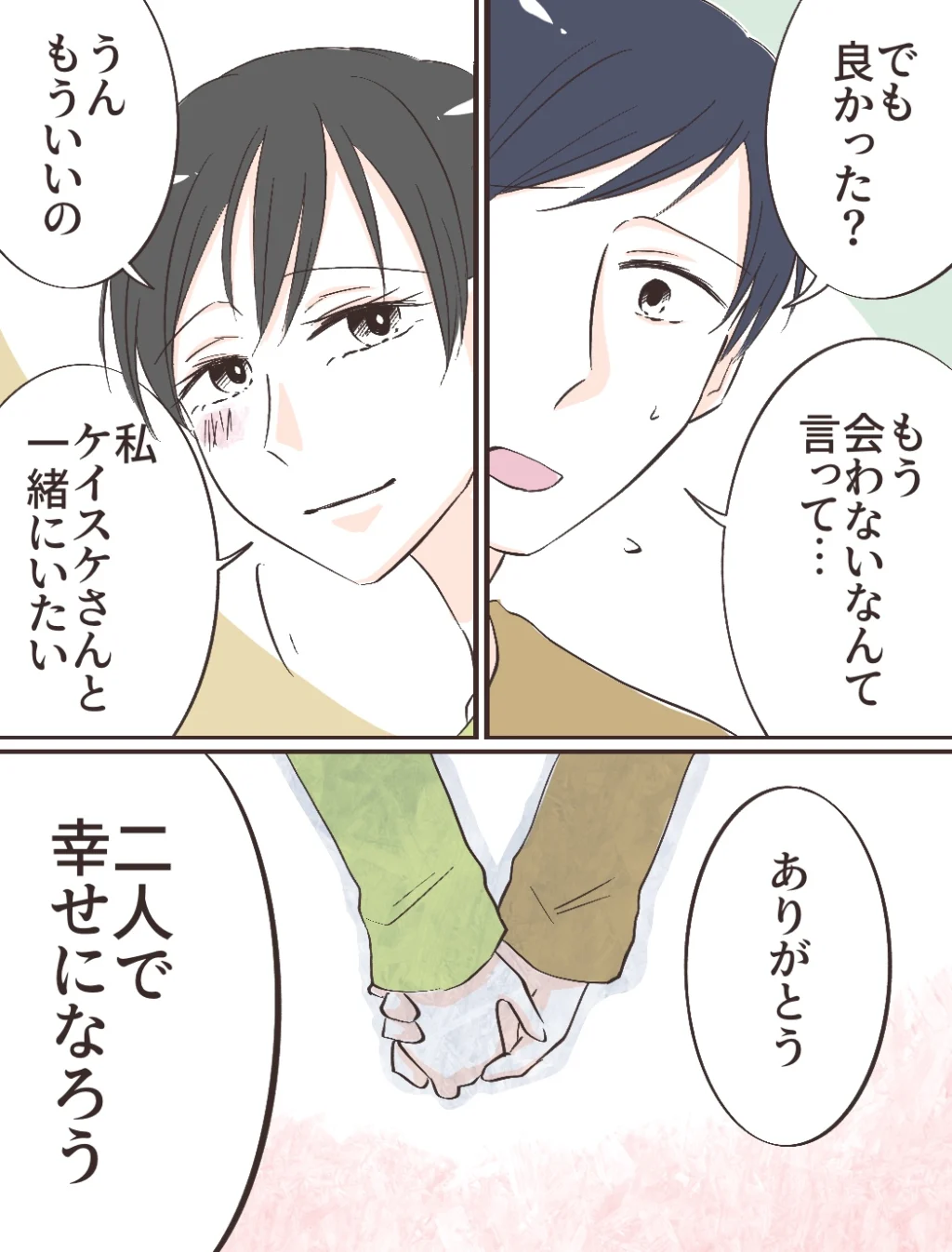 「でもよかった?もう会わないなんて言って」ケイスケさんはどこまでも私に寄り添ってくれます。私はもう、母や弟と連絡を取ることはないでしょう。「2人で幸せになろう」というケイスケさんの言葉を聞いて、ようやく新しい道を進むことができると実感しました。