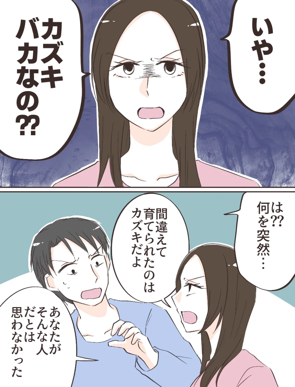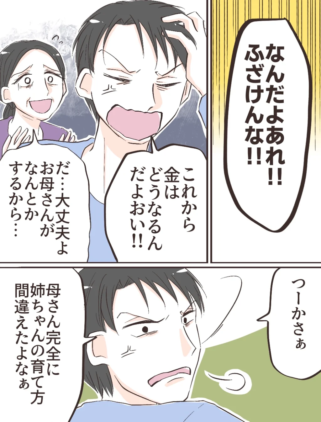 その頃実家では、「なんだよあれ、ふざけんな!これから金はどうなるんだよ!」と荒れに荒れまくるカズキ。そんな彼を見て、母は慌てて「大丈夫よ、母さんがなんとかするから」と子どもをあやすように声をかけます。するとカズキが振り返り「つーかさぁ、母さん完全に姉ちゃんの育て方間違えたよなぁ」と呆れながら言いました。