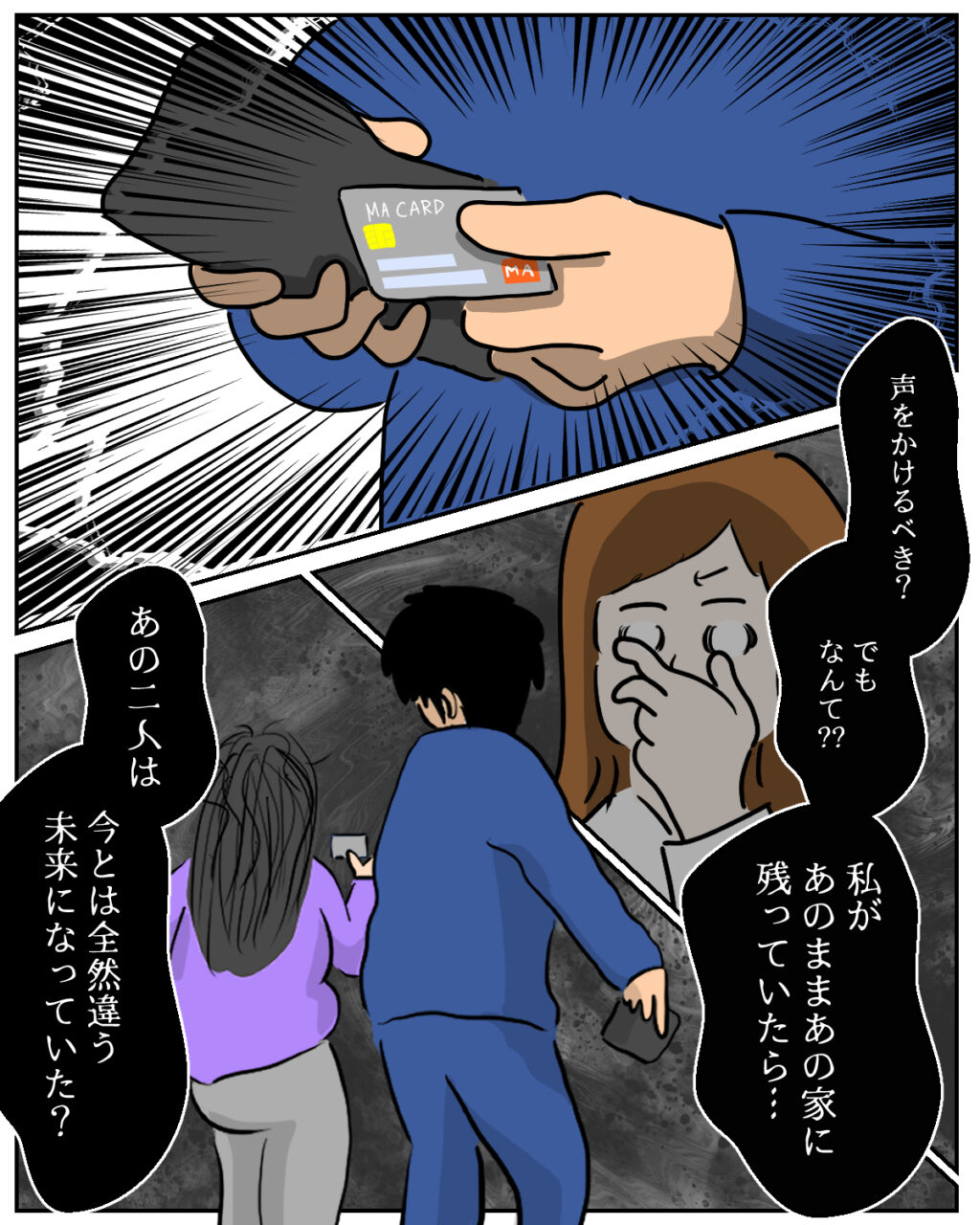 声をかけるべき?でもなんて声をかけたらいいんだろう。私があのまま、家に残っていたら2人は今とは違う未来になっていた?いろんな思いが溢れてきます。