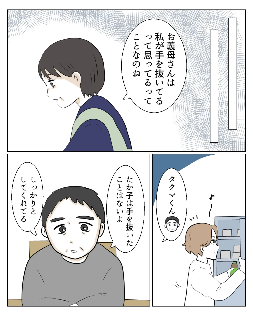 私が手を抜いていると義母はタクマくんに伝えているのでしょう。真矢から状況を聞いた夫は、キッチンに来たタクマくんに「たか子は手を抜いたことはないよ。しっかりと看てくれている」と伝えてくれます。
