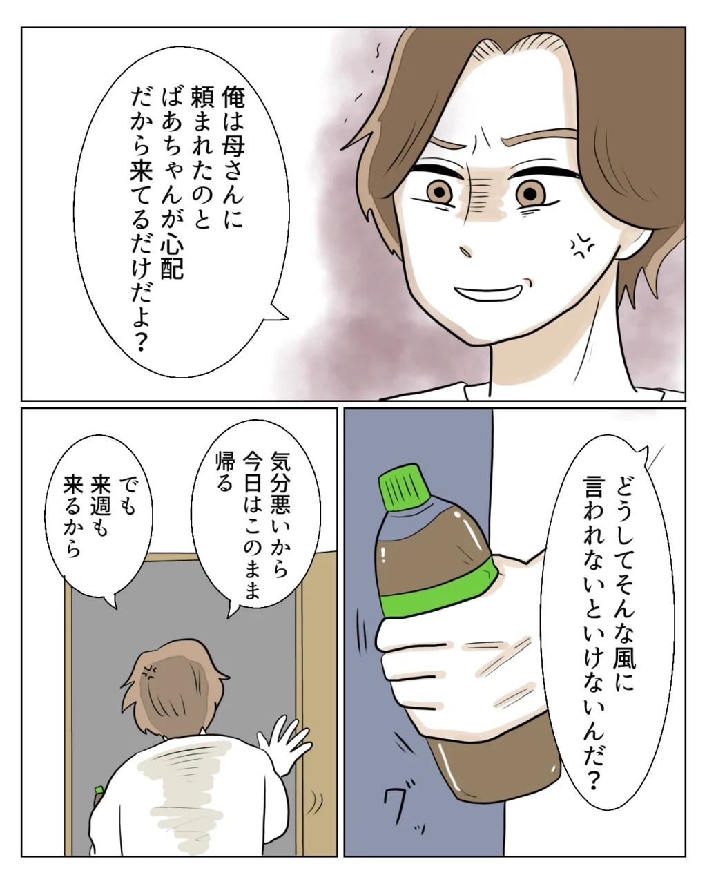 でもタクマくんは、「母さんに頼まれたのとばあちゃんが心配だから来ているだけ。どうしてそんな風に言われないといけないんだ。」心外だと言わんばかりのことを言ってきますが、夫がはっきりと言ってくれたおかげで今日はそのまま帰ってくれました。ただ、来週も来るとは言い残しましたが。