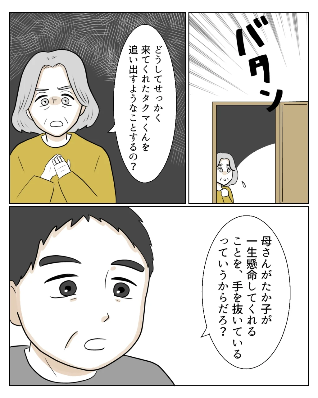 それを見ていた義母は「どうしてタクマくんを追い出すようなことをするの?」と夫を責めます。夫はあくまでも冷静に「母さんがたか子が一生懸命してくれていることを、手を抜いているって言うからだろ?」と説明します。