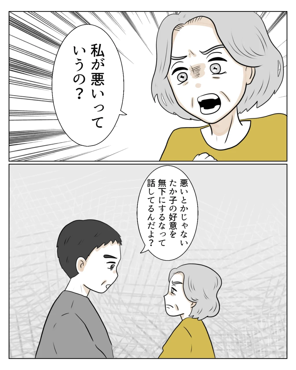 納得がいかない義母は「私が悪いって言うの!?」と怒り出します。「悪いとかじゃない。たか子の好意を無下にするなって話しているんだよ?」と夫は伝えました。