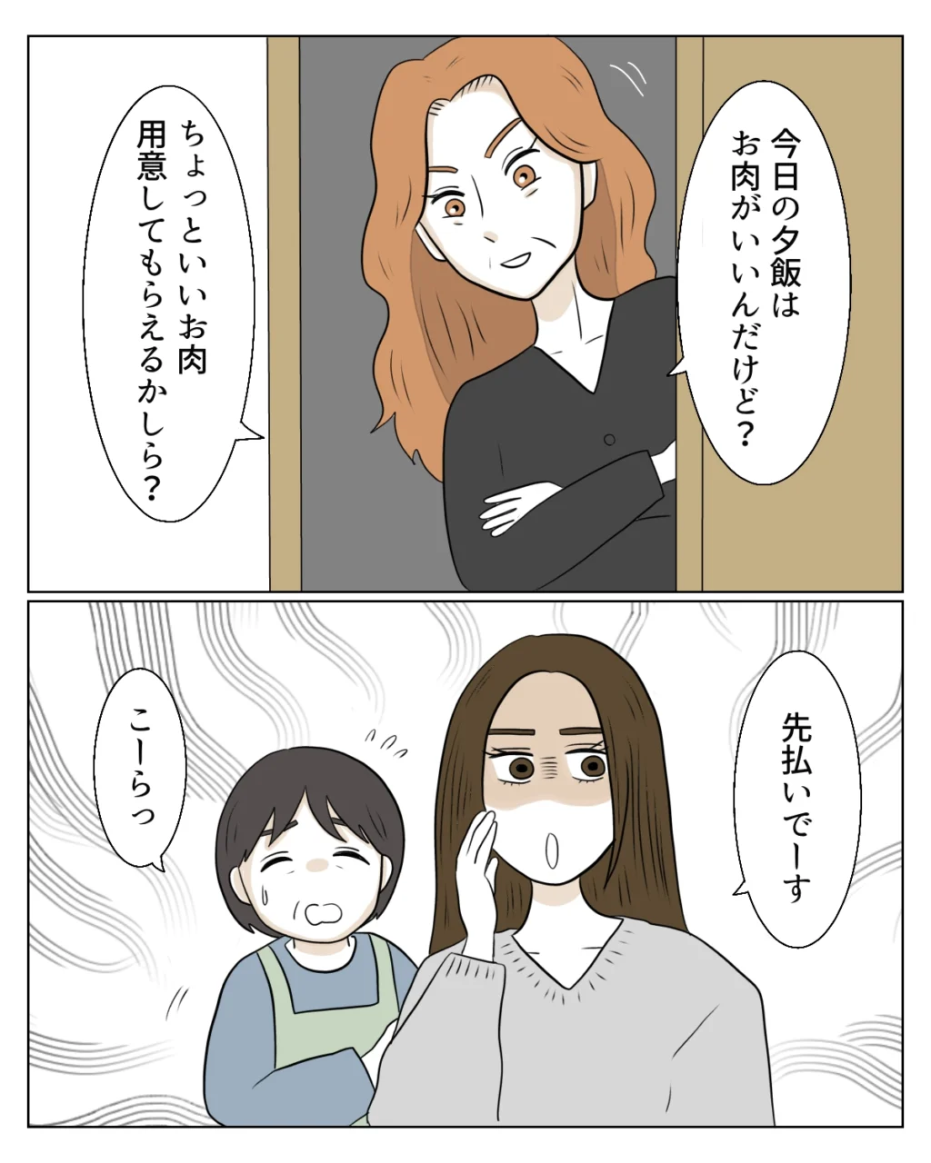 「今日の夕飯はお肉がいいんだけど?ちょっといいお肉用意してもらえるかしら?」エミさんの要求はどんどんエスカレートしていきます。しかし夕飯の代金はこちら持ち。納得がいかない真矢は「先払いでーす」と応戦します。