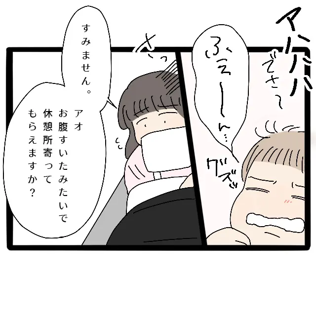 「アハハハ!でさ~」と話が尽きない義母。すると、「ふぇ~ん・・」とアオが気づいて起きそうに。とっさに「すみません。アオお腹すいたみたいで・・休憩所寄ってもらえますか?」と運転している義父にお願いすると、