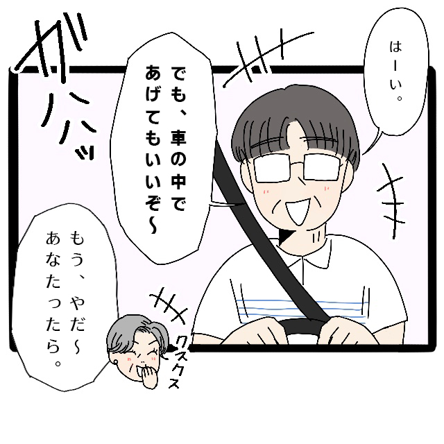 「はーい。でも、車の中であげてもいいぞ~」と笑いながら言う義父。「もう、やだ~あなたったら」と義父の言葉にクスクス笑う義母は、
