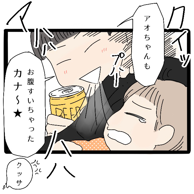 すると、「アオちゃんもお腹すいちゃったカナ~」と笑いながらアオの顔を覗き込むコウタ。臭い息がアオにかかり、「クッサ」と言いつつ怒りがこみ上げてきました。