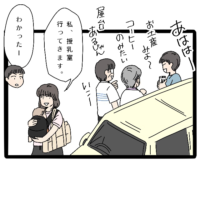 それでも何とか休憩所に到着。「私、授乳室行ってきます」私がそう言うと、「あははー!お土産みよ~」「コーヒー飲みたい」「屋台のあるじゃん」と家族3人和気あいあいで楽しそう。