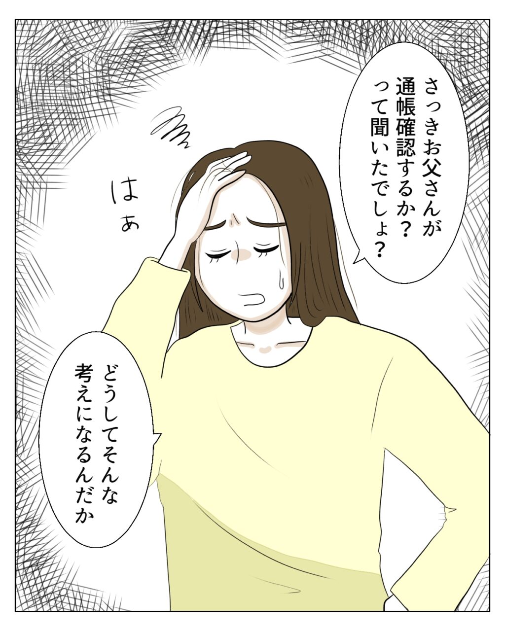 義母の言葉に呆れた真矢さんが「さっき、お父さんが『通帳確認するか?』って聞いたでしょ?はぁ・・どうしてそんな考えになるんだか」と言うと、