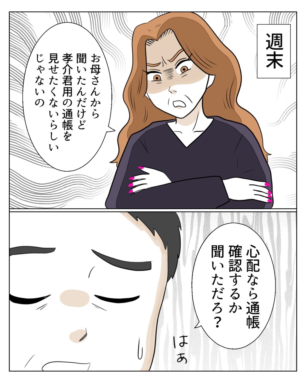 ある日、「孝介のための通帳ってどうなってる?」と突然和也さんに聞いた義母。「3万円もらってるうちの1万円を貯金している」と聞くと顔を輝かせて通帳のありかをたずねるのを見て「孝介のための通帳をどうするの?」と真矢さんが口を出すと途端に不機嫌に。「場所は伝えないから」と言う真矢さんに、「まさかもう使ったの?」と驚いて言うのでした。