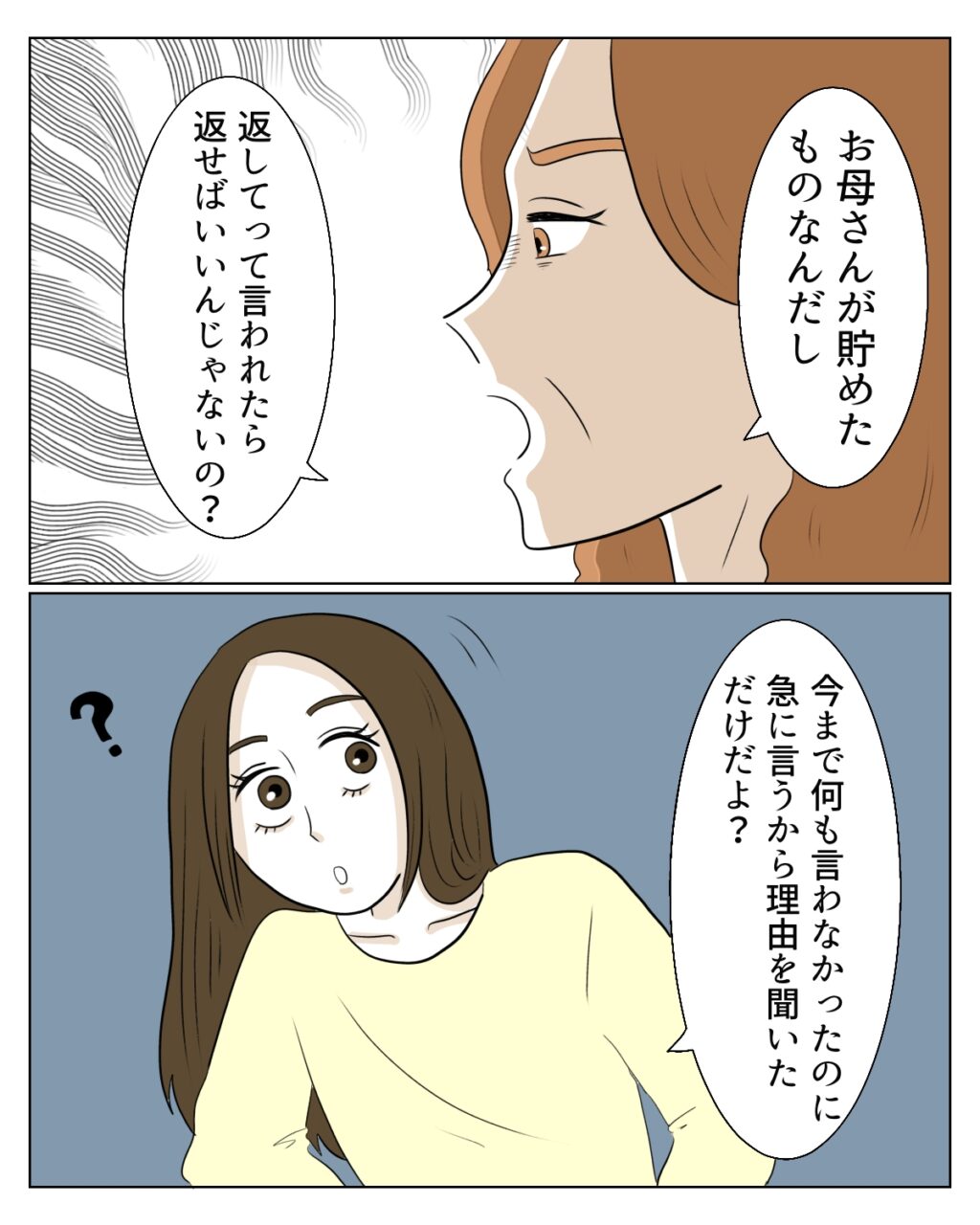 「お母さんが貯めたものなんだし、返してって言われたら返せばいいんじゃないの?」平然と言うエミさんに、「今まで何も言わなかったのに急に言うから理由を聞いただけだよ?」エミさんまでくってかかるのを不思議に思いながら真矢さんが言いました。