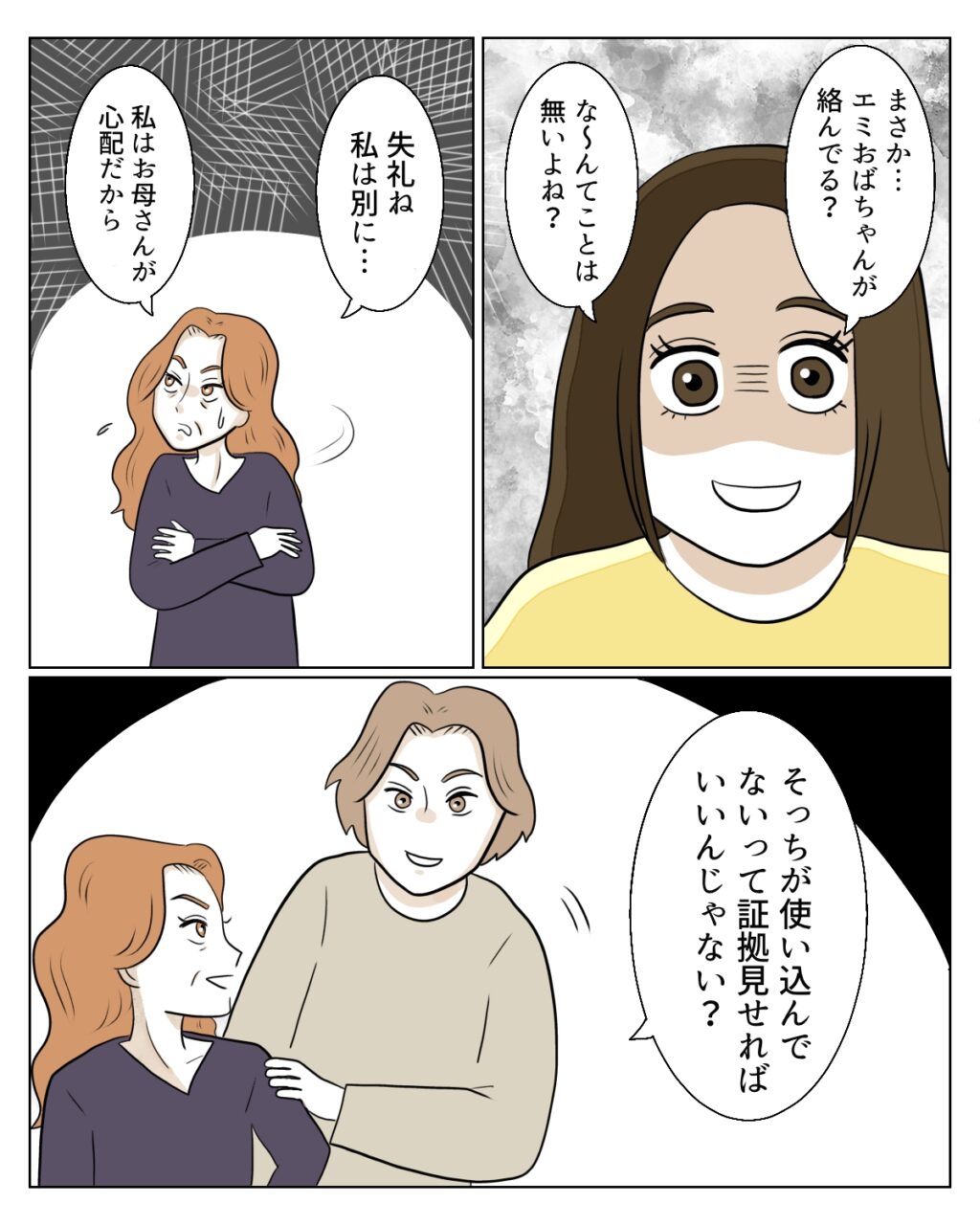 孝介くんのためにと貯金している通帳のことをやたらと気にする義母と、使い込んでいるのではと通帳を見せるよう迫るエミさん、タクマさん親子。お世話も何もせずに強気な態度でいられる図太い神経に呆れてしまいますよね。