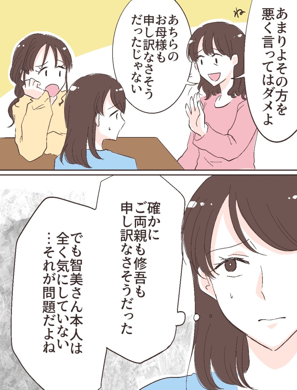 私とふみのの会話を聞いていた母は「あまりよその方を悪く言ってはダメよ。あちらのお母様も申し訳なさそうだったじゃない」と私たちをたしなめました。その言葉に「確かにご両親も修吾も申し訳なさそうだった」と思ったものの、「でも智美さん本人は全く気にしていない。・・それが問題だよね」と悩ましく思いました。