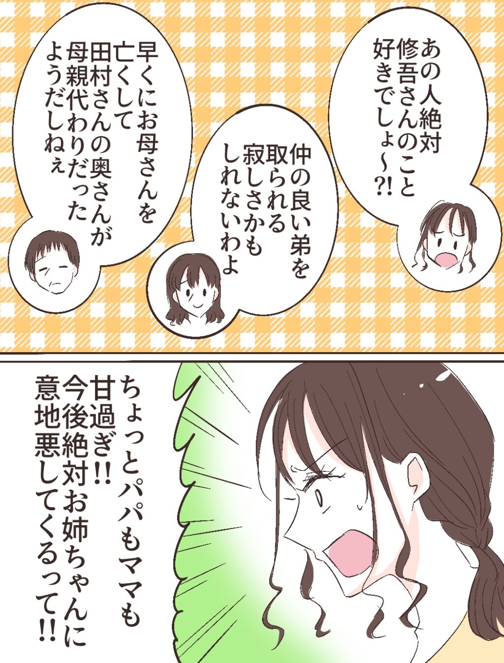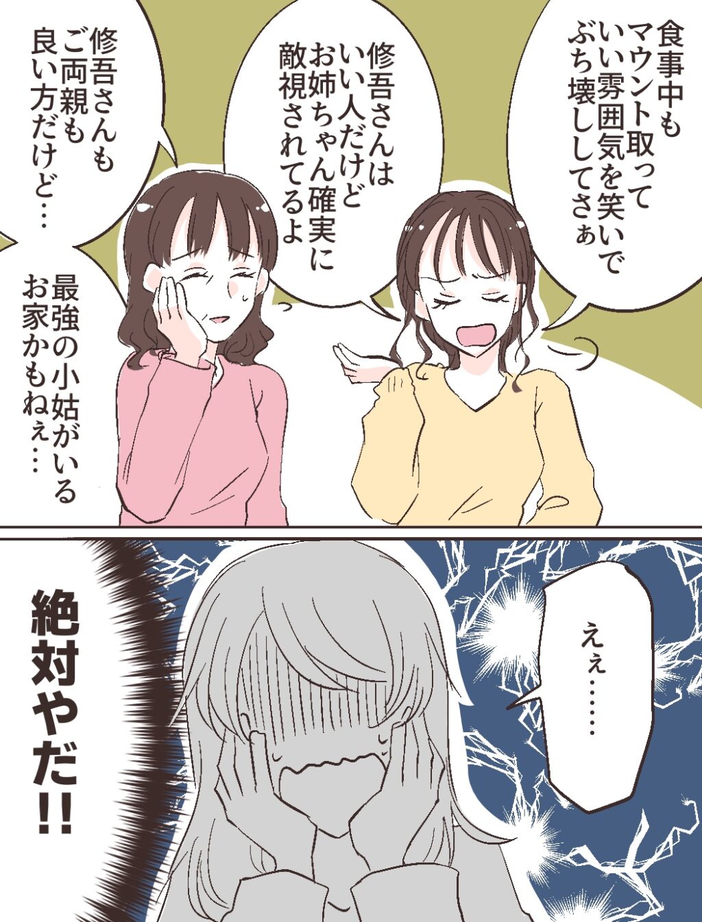 「食事中もマウント取っていい雰囲気を笑いでぶち壊ししてさぁ、修吾さんはいい人だけど、お姉ちゃん確実に敵視されてるよ」ふみのがそう言うと、「修吾さんもご両親も良い方だけど・・最強の小姑がいるお家かもねぇ・・」と母も困惑したように言い、私は「えぇ・・」と言いながら、心の中で「絶対やだ!!」と叫んだのでした。
