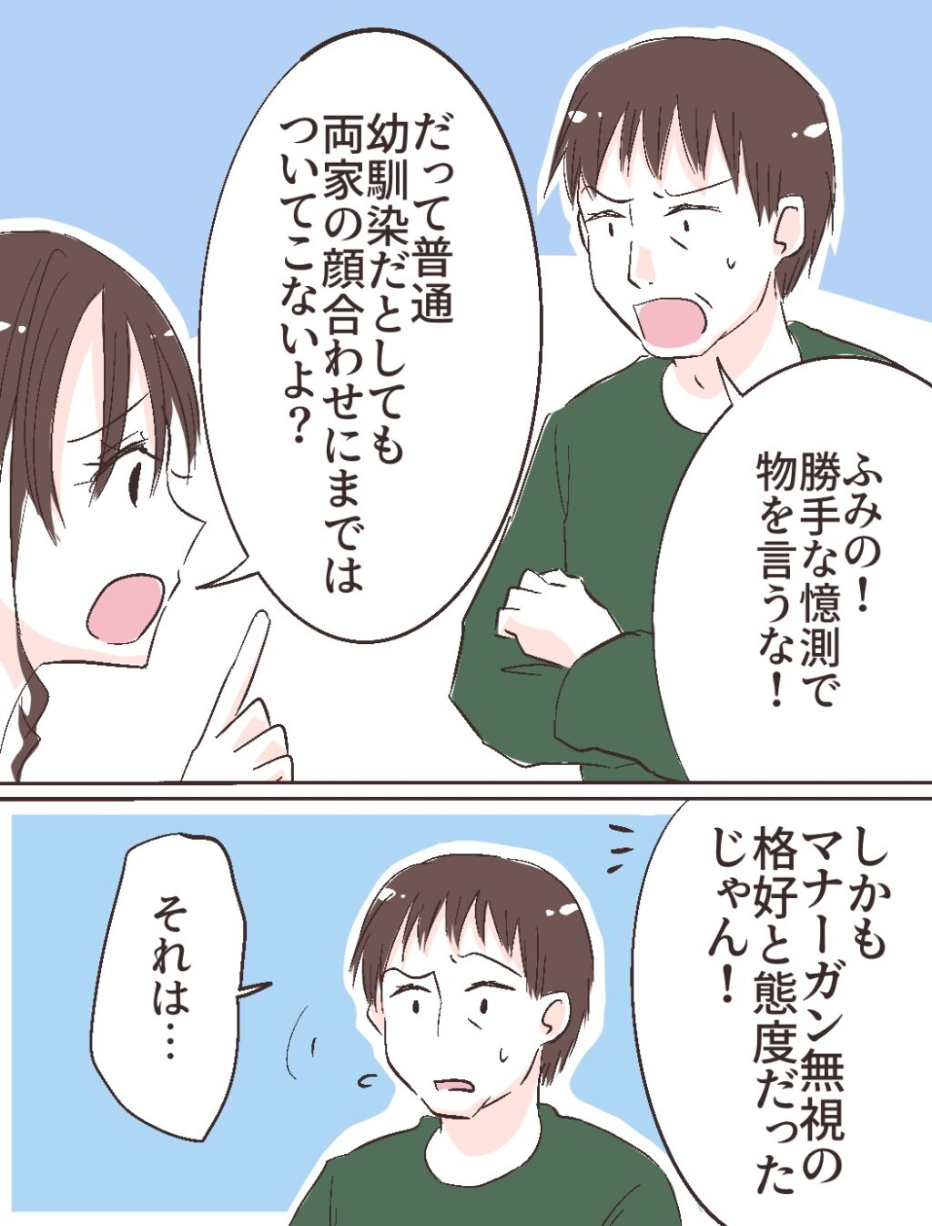 すると父が「ふみの!勝手な憶測で物を言うな!」とふみのをたしなめると、「だって普通幼馴染だとしても、両家の顔合わせまではついてこないよ?」と正論を言い返し、「しかもマナー、ガン無視の格好と態度だったじゃん!」ふみのの言葉にそれも一理あると思ったのか、「それは・・」と父が言葉を詰まらせました。