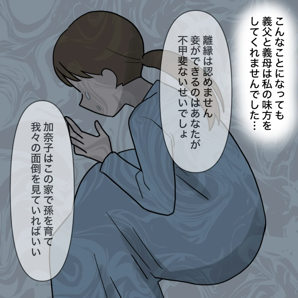 こんなことになっても、義父と義母は私の味方をしてくれませんでした。それどころか「離縁は認めません。妾ができるのはあなたが不甲斐ないせいでしょ」と責められ「この家で孫を育てて我々の面倒を見ていればいい」と言われました。私は義父と義母の面倒をみるために存在しているの?産まれてくる我が子でさえこの家の所有物になってしまうの?