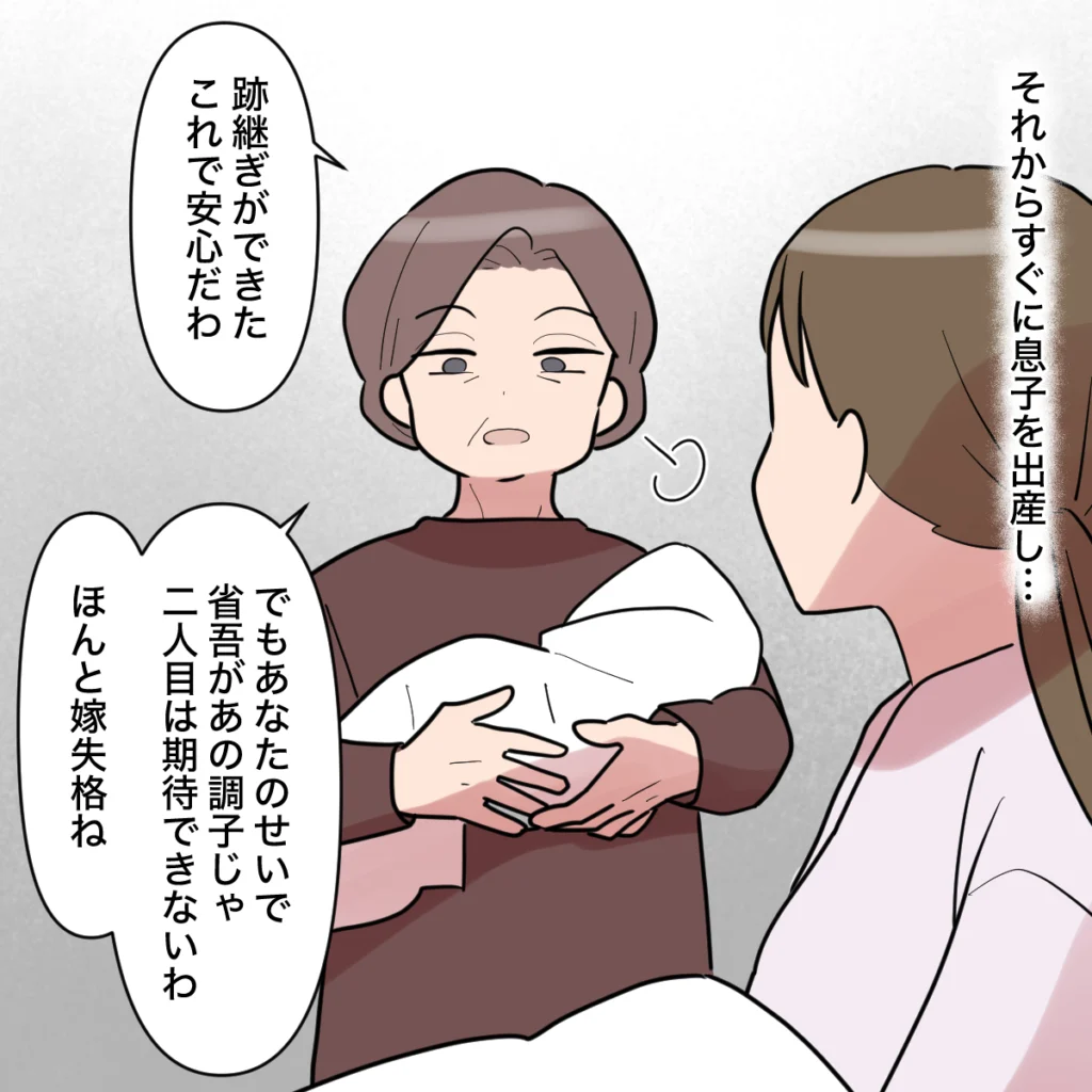 私はそれからすぐに息子の渉を出産しました。義母はすぐに渉を私から取り上げ「跡継ぎができた。これで安心だわ」と満足そうに言うと「でも、あなたのせいで省吾があの調子じゃ二人目は期待できないわ。ほんと嫁失格ね」と言い放ちました。