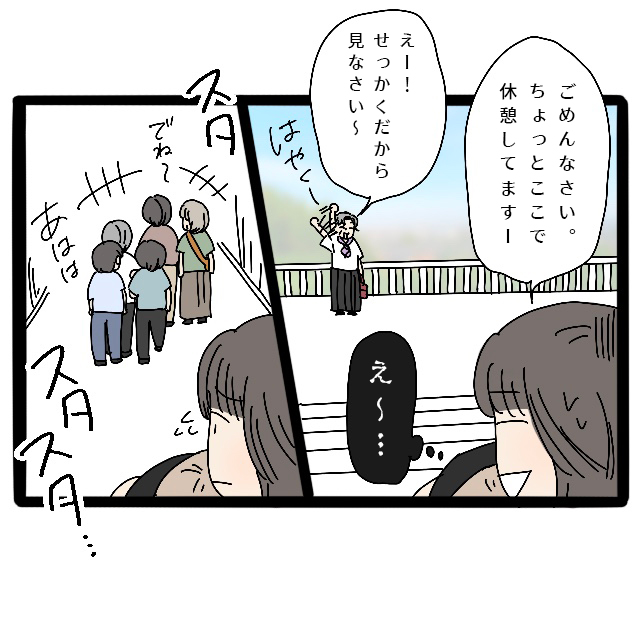 アオを抱っこしていることもあり、休めそうなところではできるだけ休みたい。そう思った私は、みんなが景色に目を向けている隙を見て、「ごめんなさい、ちょっとここで休憩してます」と声をかけました。ところが義母は、「えー!せっかくだから見なさい」と、私の休憩を許してくれません。その後も、私が遅れていることなど気にも留めず、みんなはそのままスタスタと歩いていきます。