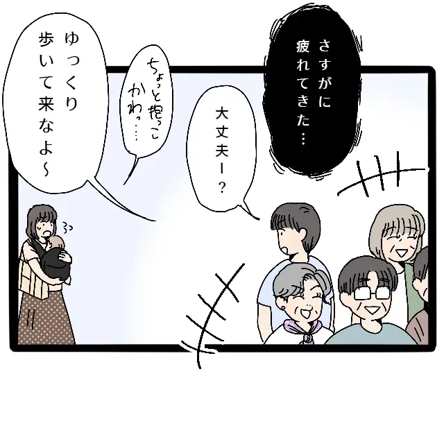 腰も足も、そろそろ限界。すると、遅れている私に気づいたコウタが「大丈夫?」と声をかけてくれます。けれど、アオを代わりに抱いてくれるわけでも、そばに来てくれるわけでもなく、「ゆっくり歩いてきなよ~」とだけ言って、前を向いて歩き出してしまいました。