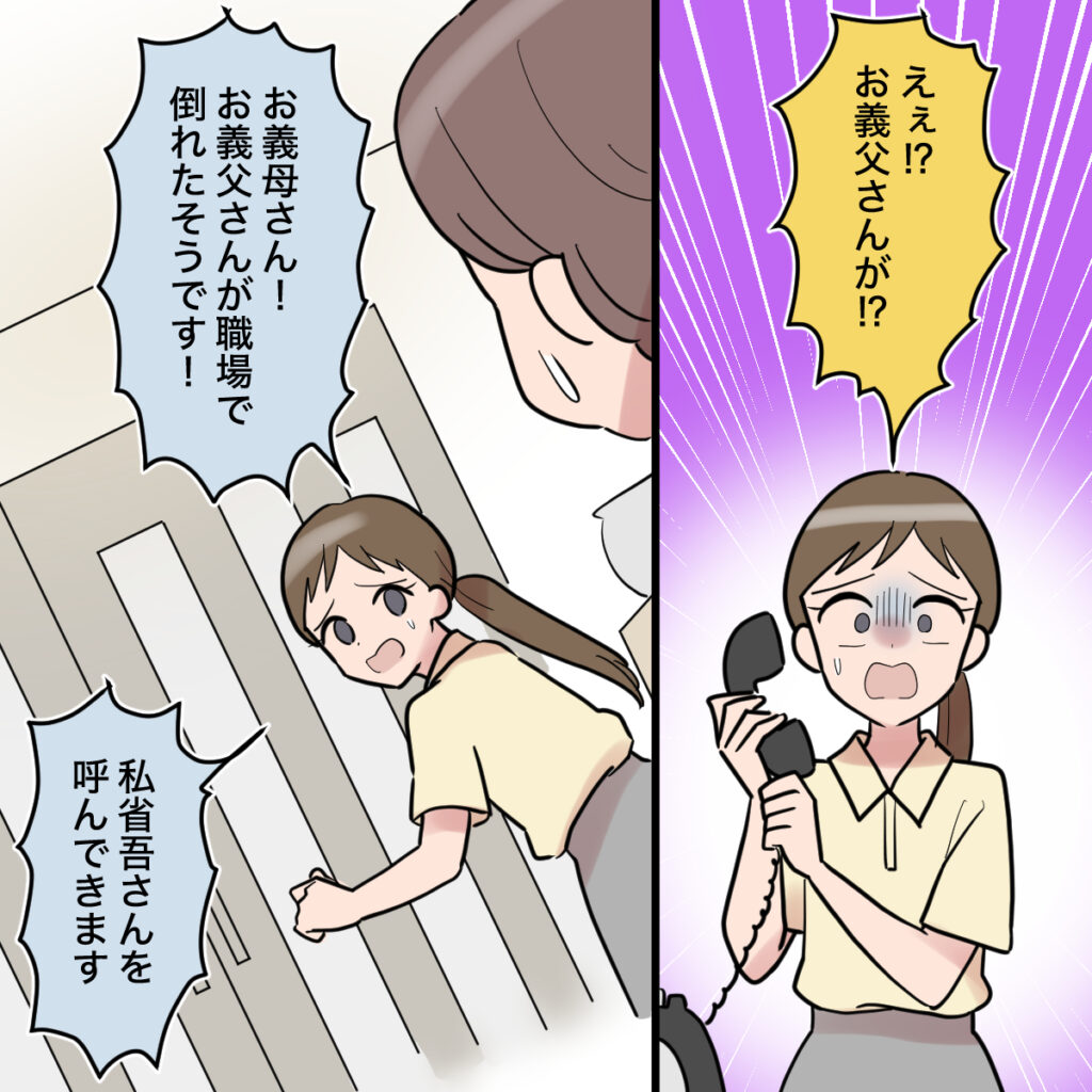 それからしばらく経ったある日、義父が倒れたという電話がかかってきました。「お義母さん!お義父さんが職場で倒れたそうです!私、省吾さんを呼んできます」と義母に伝え、私は急いで愛人宅にいる省吾さんを呼びに行きました。