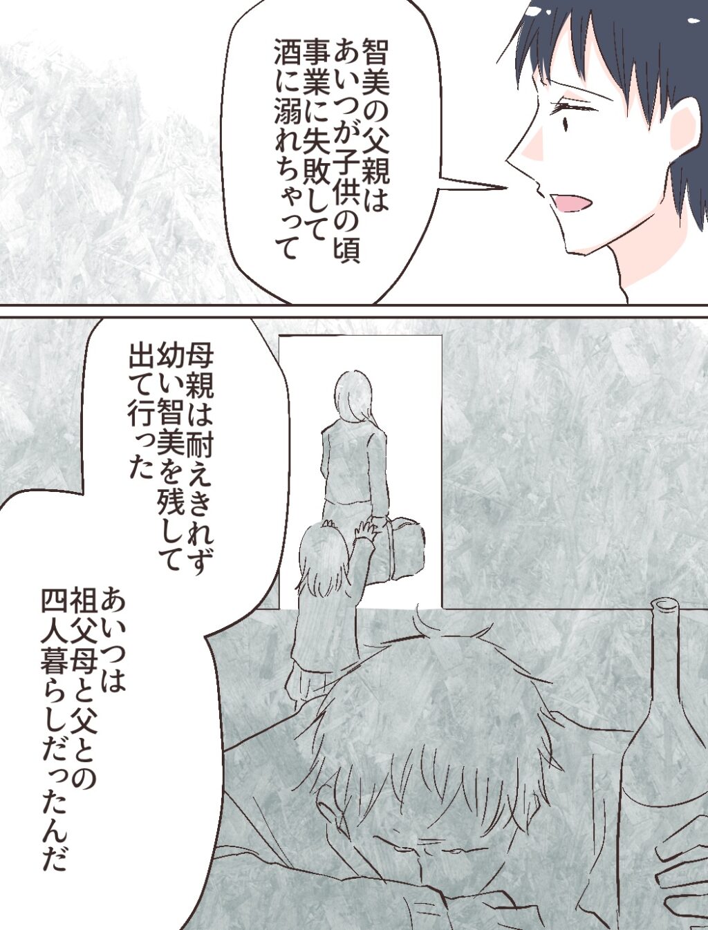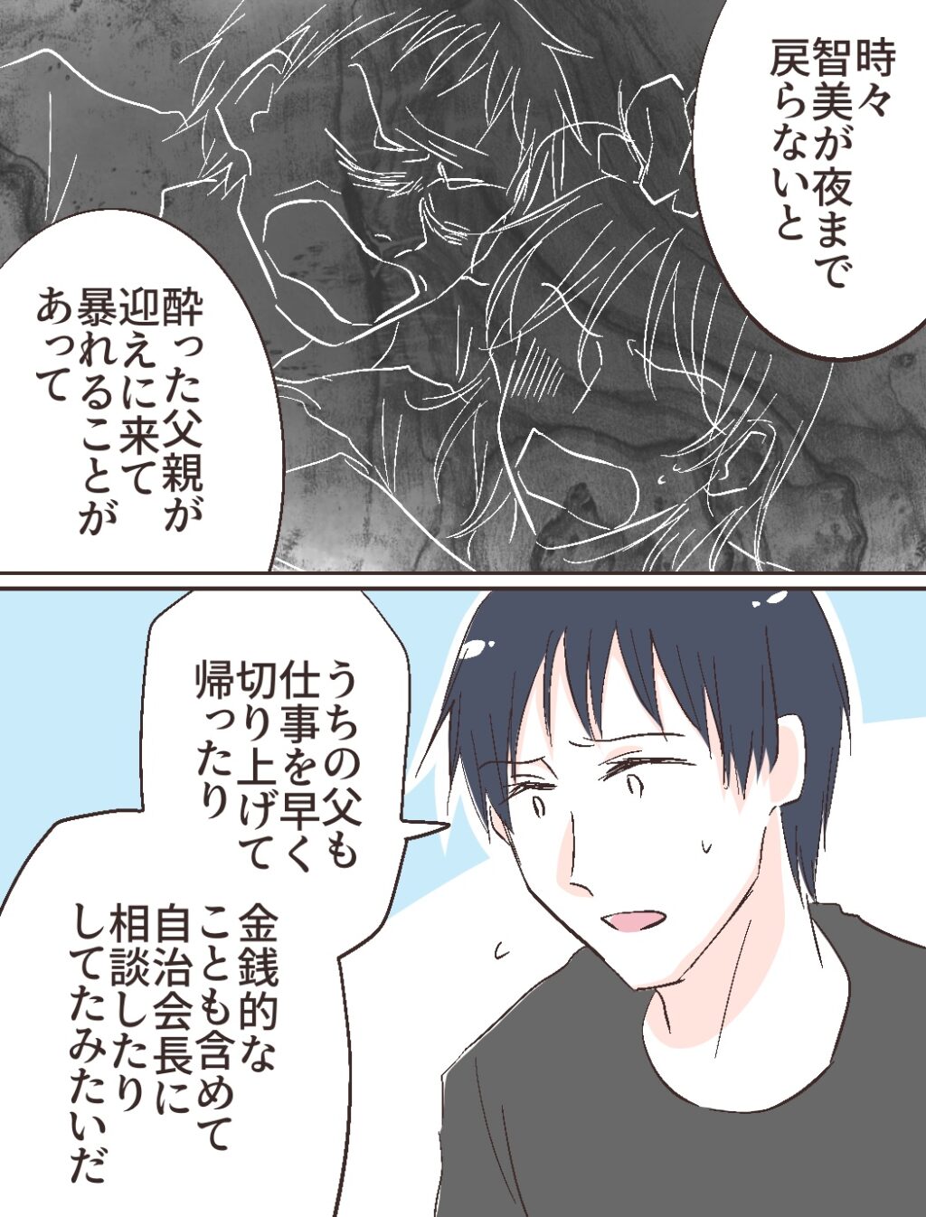 父親と2人暮らしになった智美さんがしょっちゅう修吾の家に来て過ごすようになり、夜まで帰らないと酔った父親が迎えに来て暴れることが時々あって、修吾のお父さんが仕事を早く切り上げて帰ったり、自治会長に金銭的なことも含めて相談したりしていて、智美さんは修吾の幼馴染と言うよりは修吾のご両親が長い間智美さんの面倒をみていたことが分かりました。