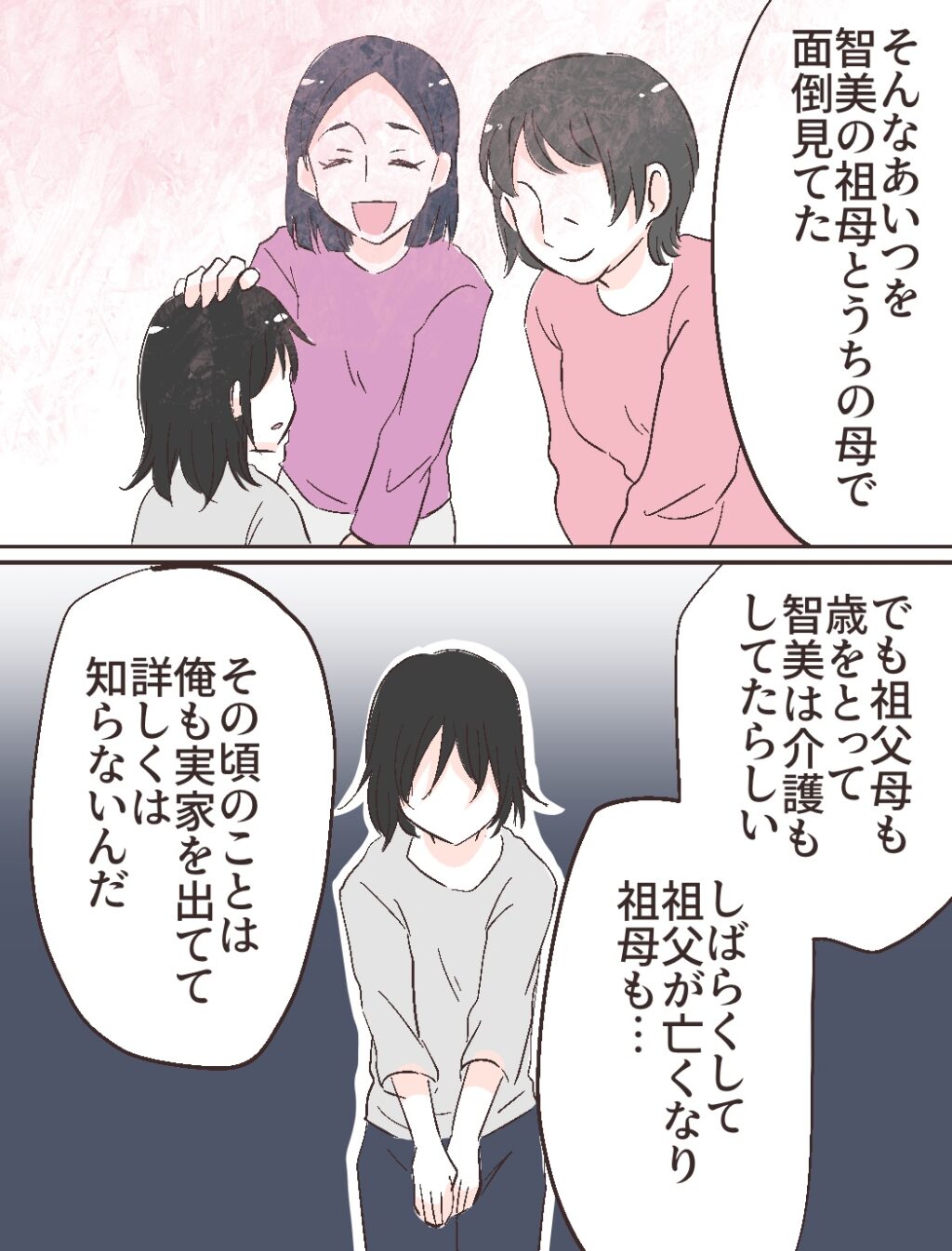 智美さんのおばあさんが母親代わりとなり、隣人の修吾のお母さんもなにかと智美さんの面倒をみていましたが、時が経ち、祖父母ともに亡くなった頃のことは、もう実家を出ていた修吾にはわからないようです。