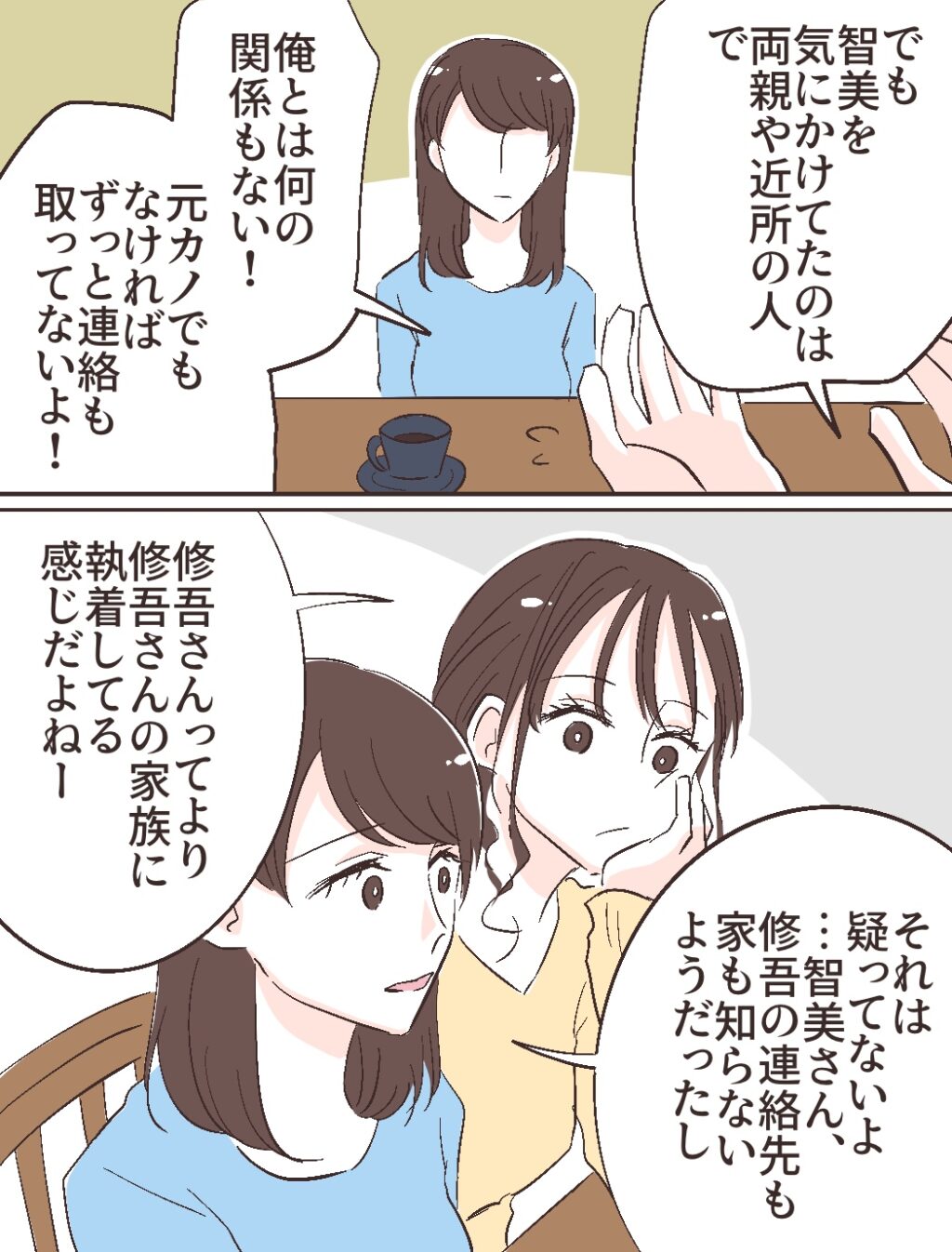 私ももちろん修吾のことを疑ったりなどしていません。智美さんの生い立ちを聞いて、私とふみのは智美さんが修吾よりもむしろ修吾の家族に執着しているのだと理解したのです。