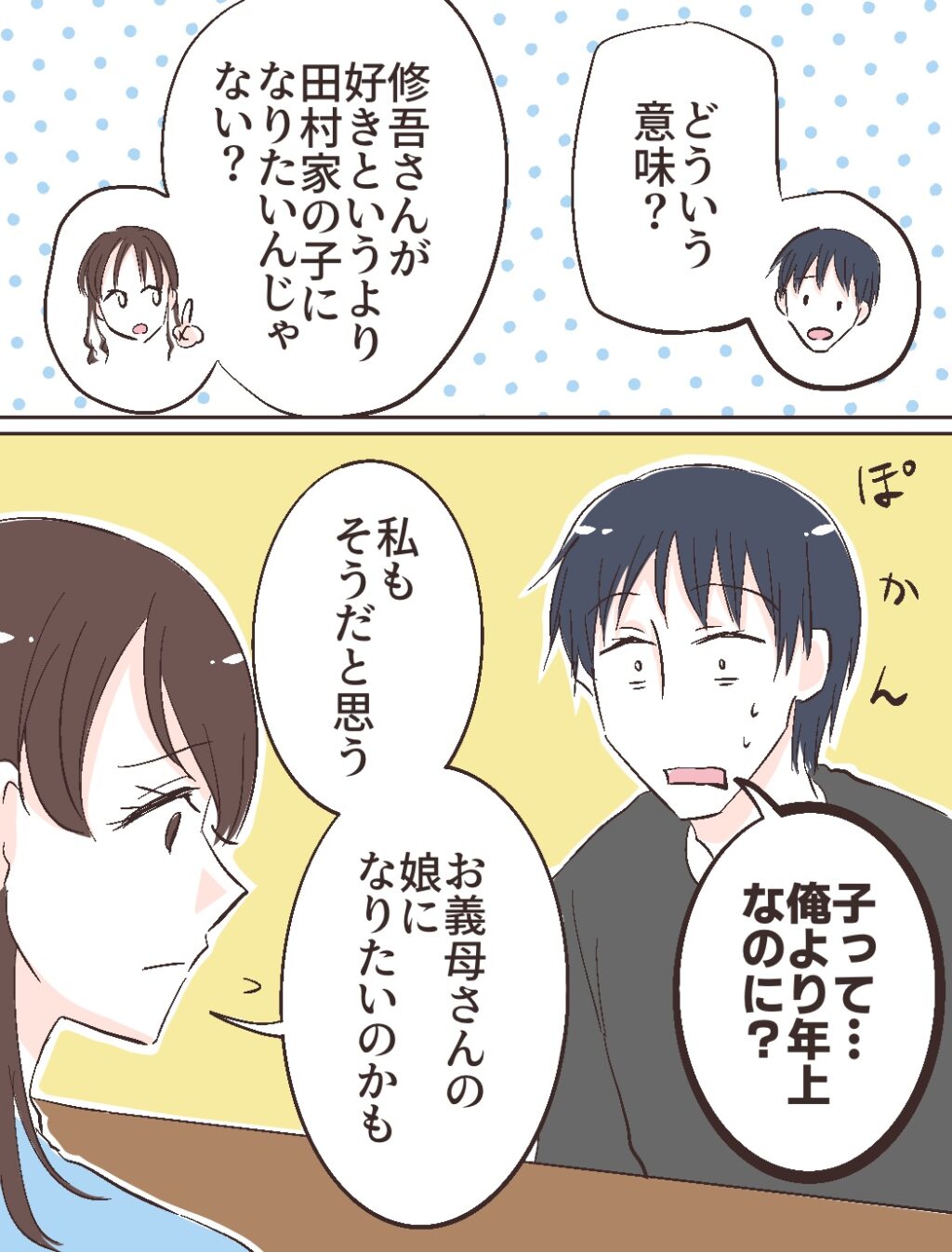 私とふみのの言葉を聞いて修吾は全く意味が分からないといった様子でした。自分よりも年上の、実家の隣に住む女性が自分の親の子どもになりたいなんて、普通では考えられないのもわかります。でも修吾が結婚して実家に住まないとわかった時の智美さんの動揺のしかたを思い出すと、智美さんにとっては真剣なことなのかもしれません。
