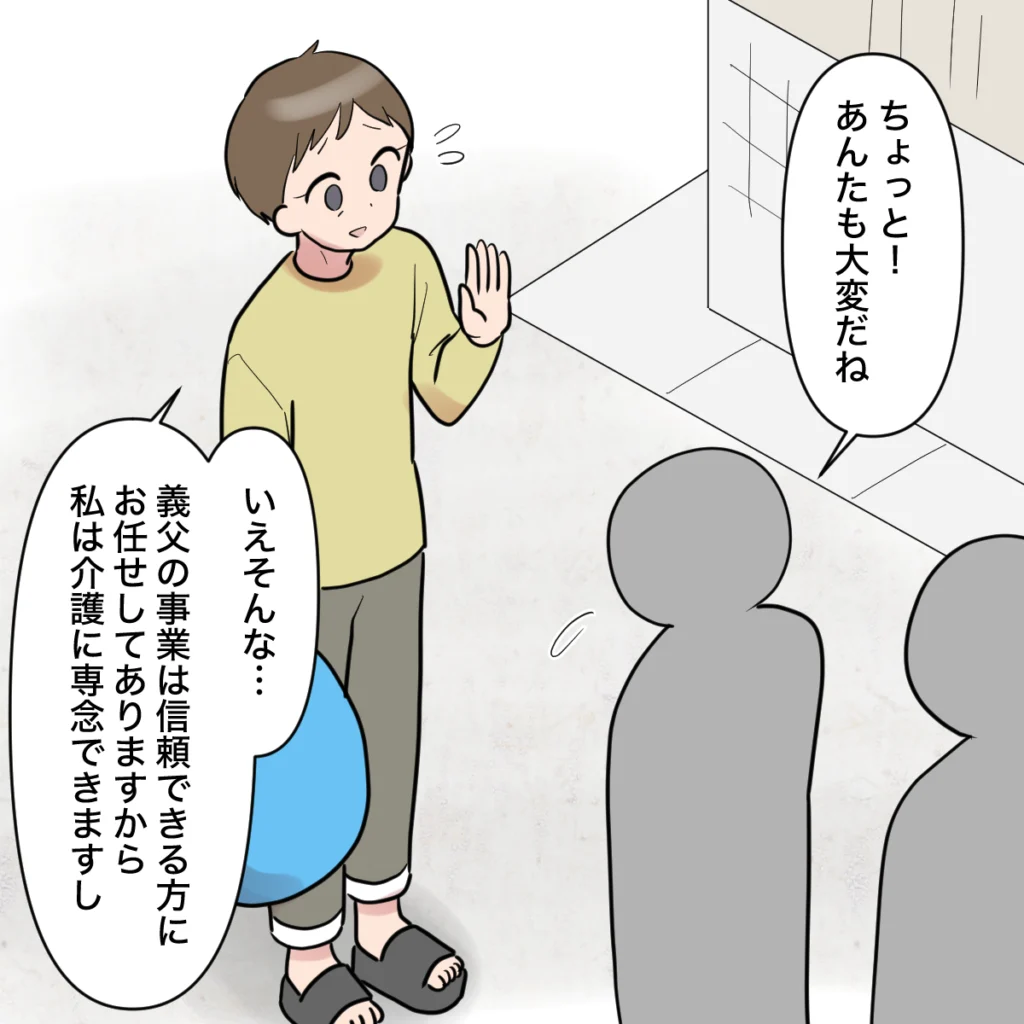 するとご近所さんが、「ちょっと!あんたも大変だね」と声をかけてくれました。私は「いえそんな・・・義父の事業は信頼できる方にお任せしてありますから私は介護に専念できますし」と控えめに答えます。